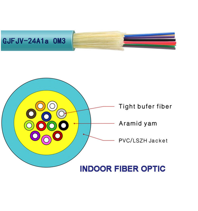 يتم تصنيع كبل الألياف الضوئية الداخلي GJFJV عن طريق تطبيق خيوط من خيوط الأراميد أو خيوط زجاجية عالية القوة بشكل متساوٍ كعضو قوي يزيد عن 900 ميكرومتر أو ф600 ميكرومتر من الألياف العازلة الضيقة ثم يتم استكماله بغلاف PVC (LSZH).